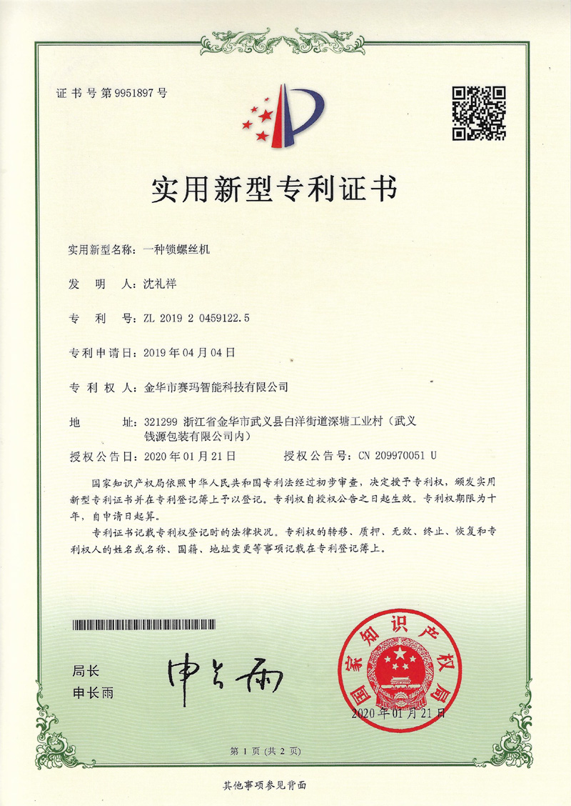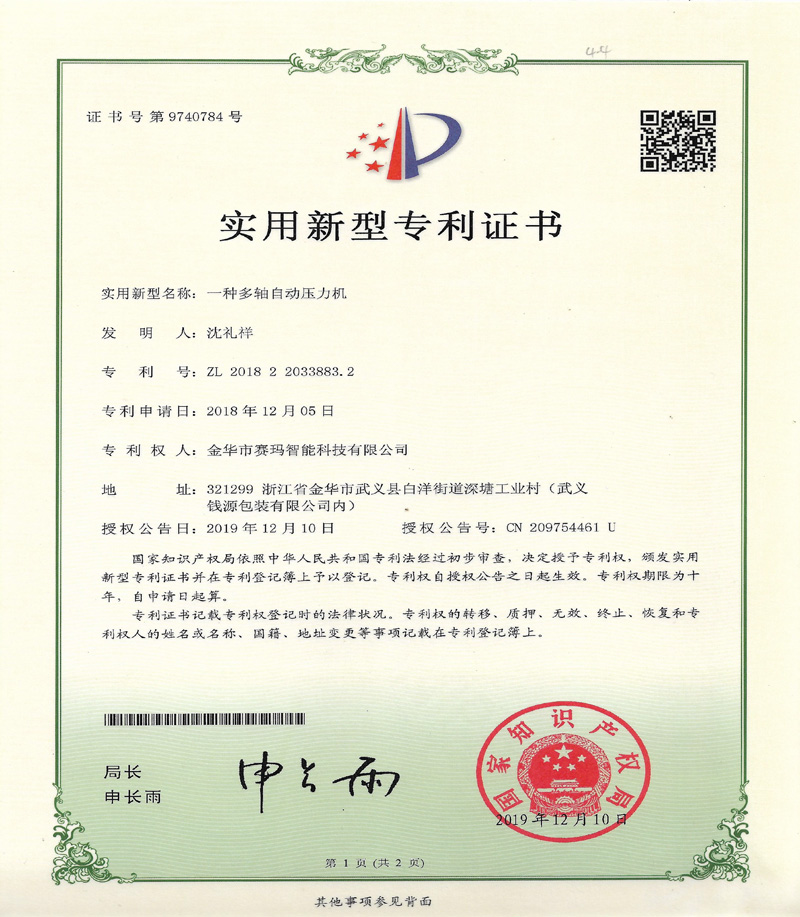 2019年 獲得含“齒輪壓裝機”鎖螺絲機”在內(nèi)的多項項國家發(fā)明專利